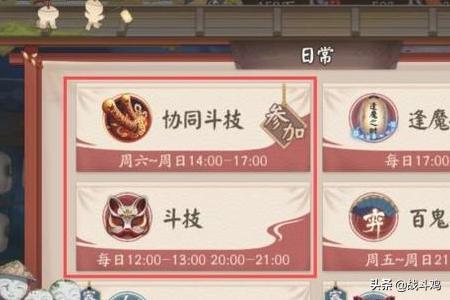 操作方法:点击町中牌子,选择协同斗技和斗技的灯笼即可,协同斗技只有星期六星期天才会开启,都没每天固定时间开启。还有一种,点击庭院中的石像,就会弹出一个方框,点击相应的项目即可。